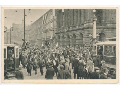 49 - Praha, oživená partie před Národním divadlem 28.10.1918, neprošlá poštou cca 1928