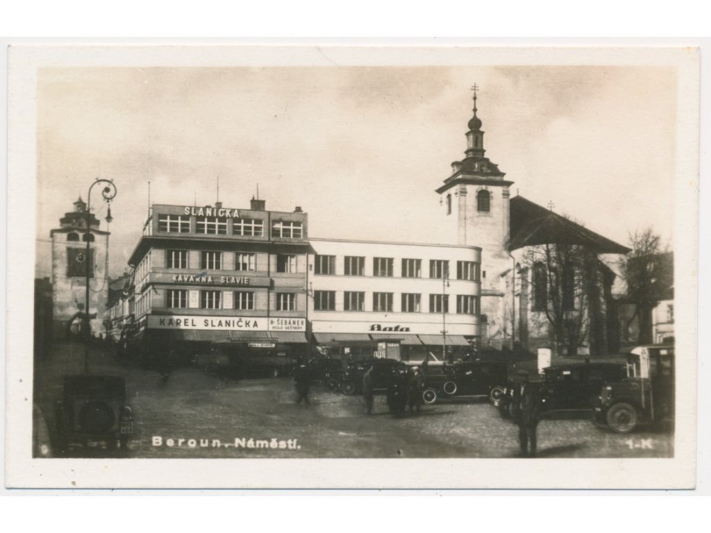 02 - Beroun, oživené náměstí, automobily, Kavárna Slavie..., cca 1946
