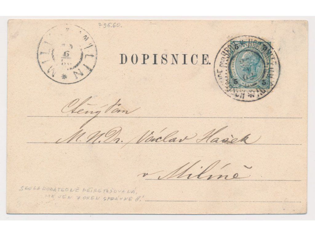 02 - Berounsko, Hostomice, Pohled na oživené náměstí s koňským povozem, prošlá poštou 1902