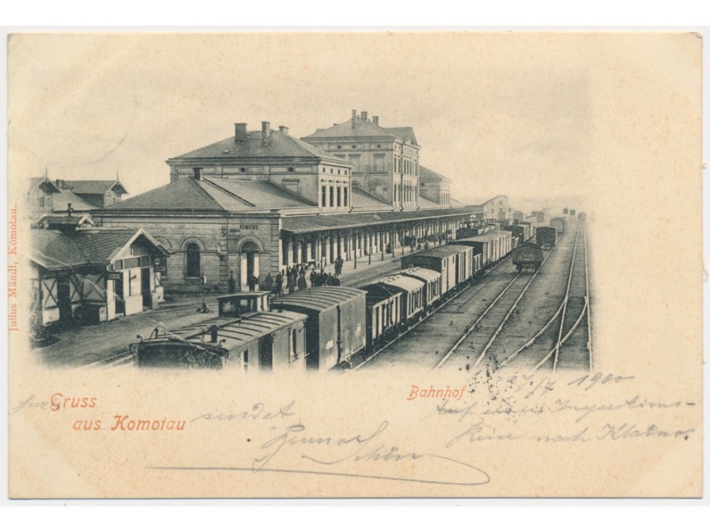 09 - Chomutov, Bahnhof, nádraží, oživená partie s vlaky, cca 1900