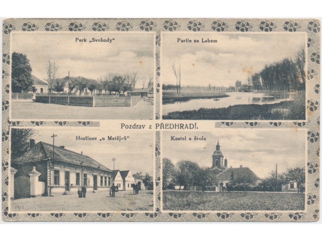 10 - Chrudimsko, Předhradí, 4 - záběr, hostinec U Matějů, kostel..., cca 1930