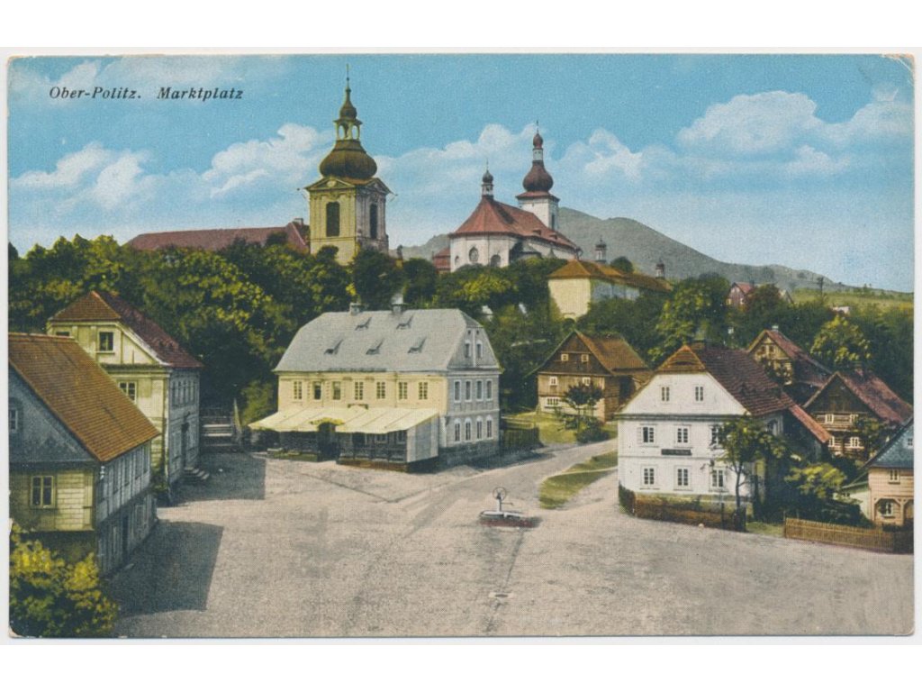 11 - Českolipsko, Horní Police, partie z návsi s kostelem a domy, 1923