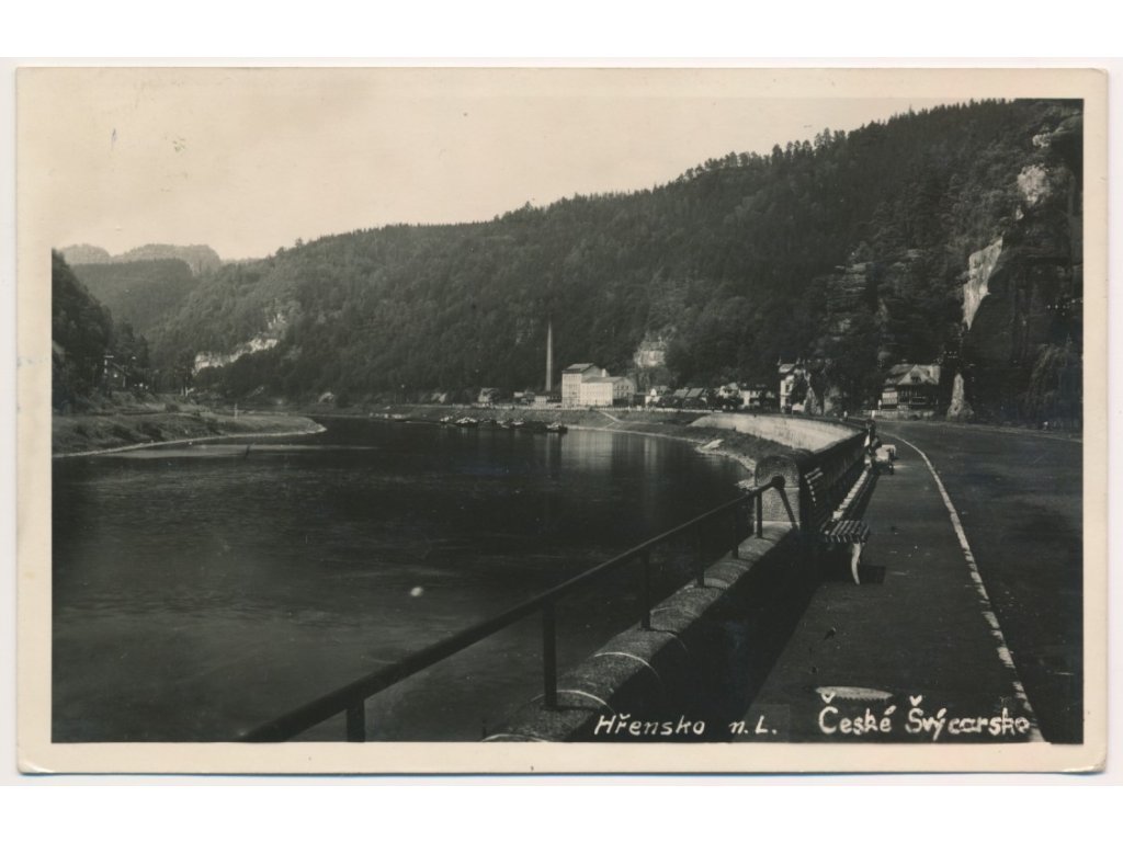 14 - Děčínsko, Hřensko, pohled z nábřeží na řeku a okolí, cca 1925
