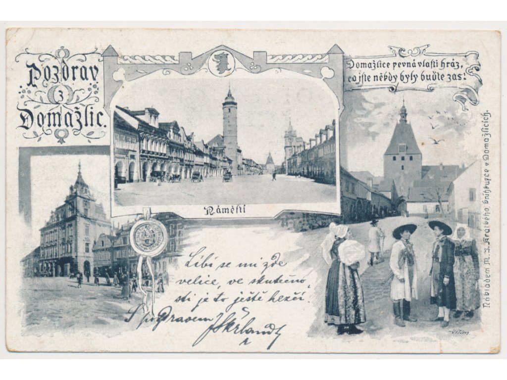 15 - Domažlice, 3 záběrová koláž oživených partií města, cca 1898
