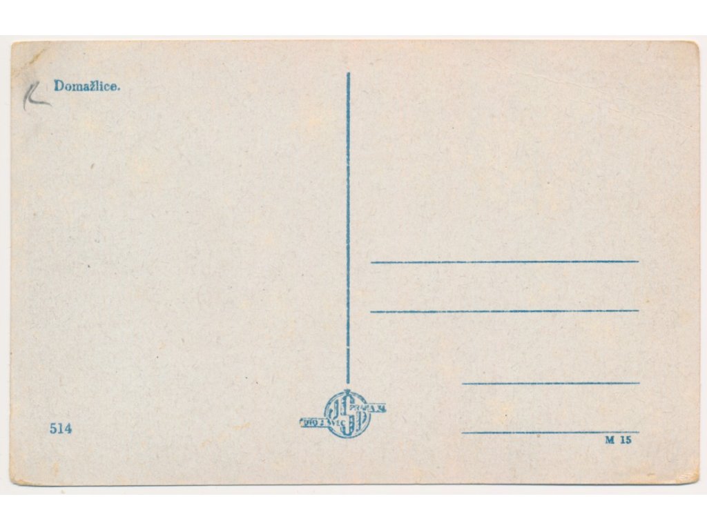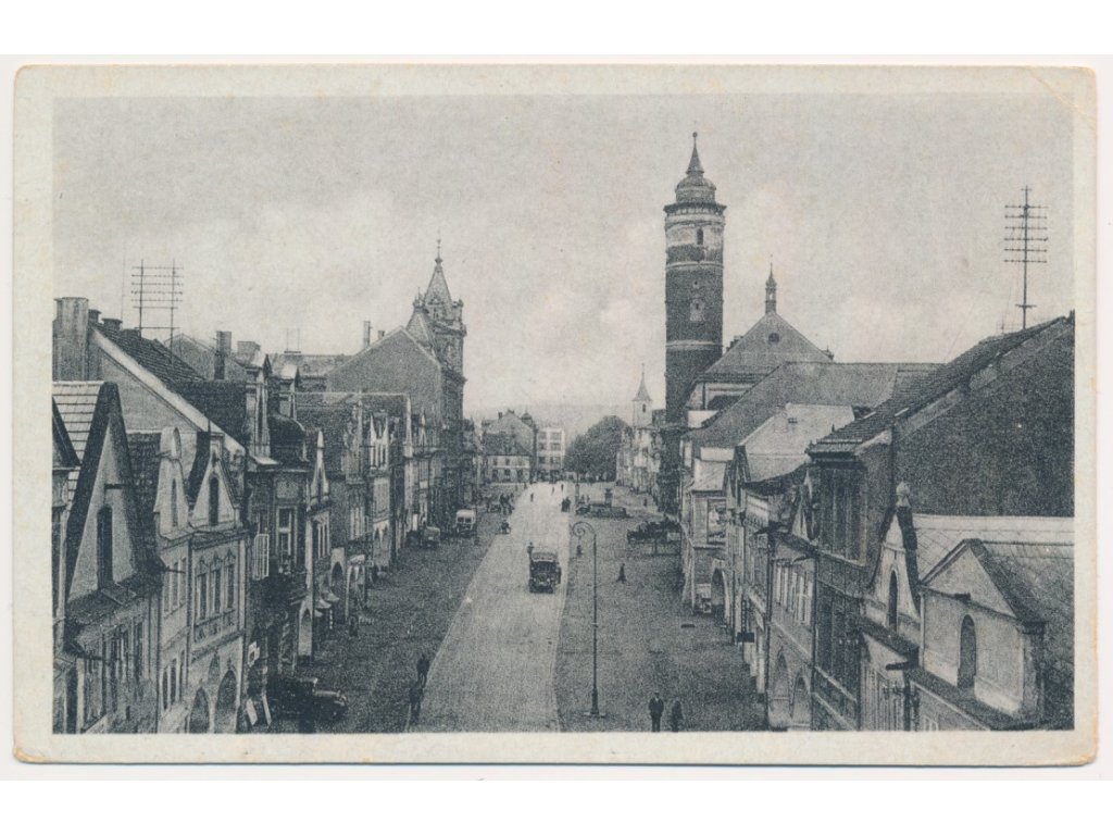 15 - Domažlice, pohled na oživené náměstí se šikmou věží, cca 1939