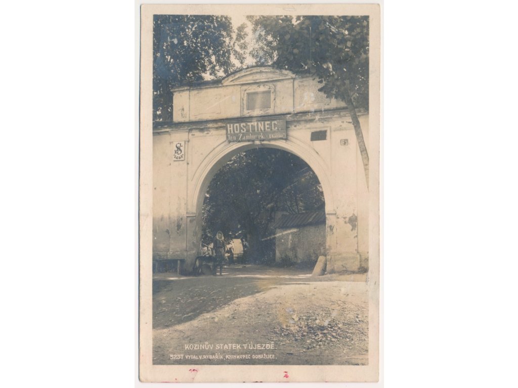15 - Domažlicko, Újezd, Hostinec, oživená partie, Kozinův statek, cca 1926