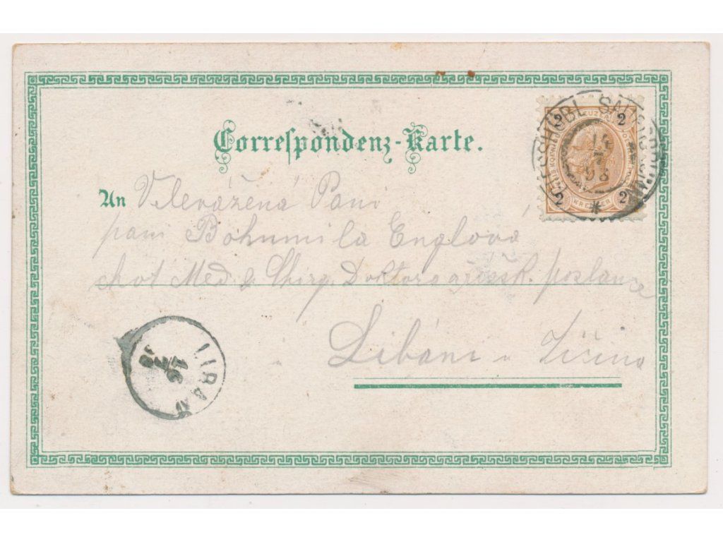 25 - Karlovarsko, Kyselka (Giesshübl-Sauerbrunn), 4 záběrová litografie s dominantami lázeňské obce, 1898