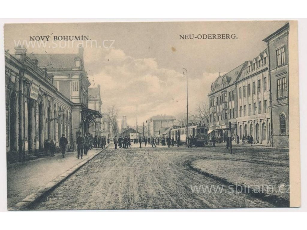26 - Karvinsko, Bohumín, oživená Hlavní ulice, tramvaj..., cca 1930
