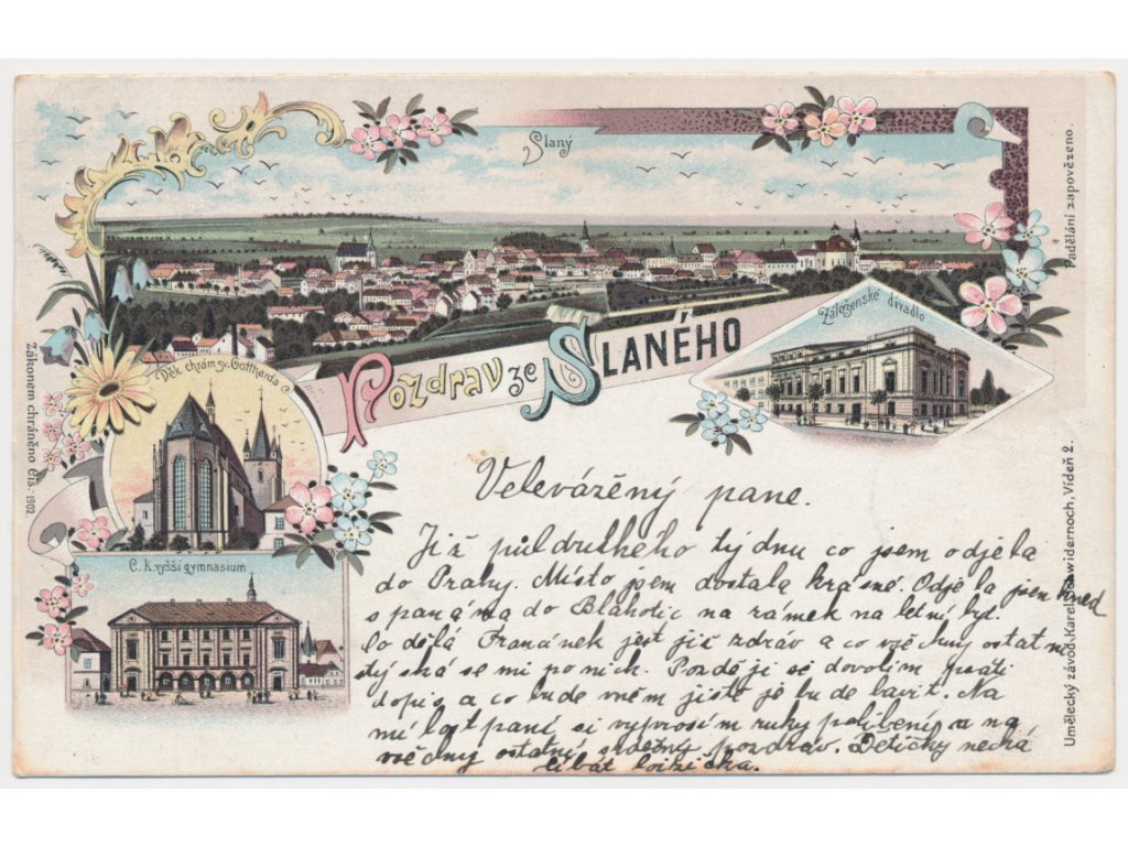 27 - Kladensko, Slaný, 4 záběrová secesní litografická koláž dominant, 1898