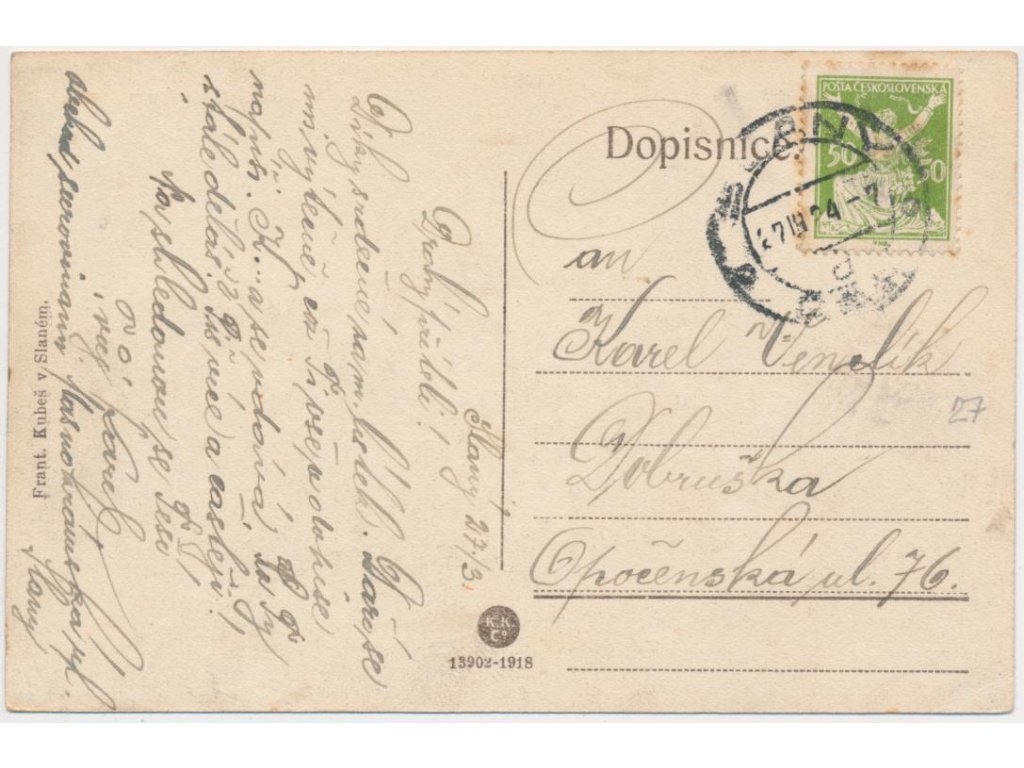 27 - Kladensko, Slaný, oživené náměstí s kašnou, cca 1924