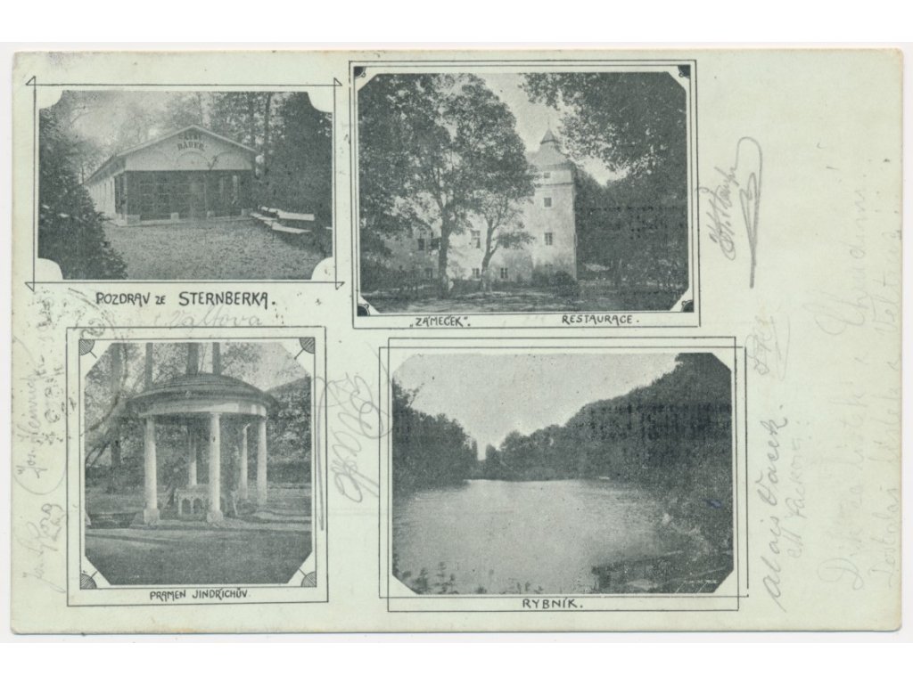 27 - Kladensko, Šternberk-Ledce, 4 záběrová koláž, mj. restaurace, zámeček...,1905