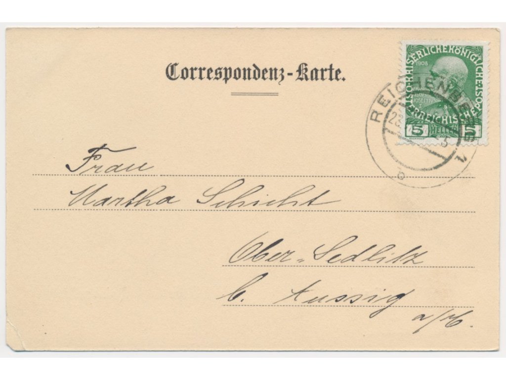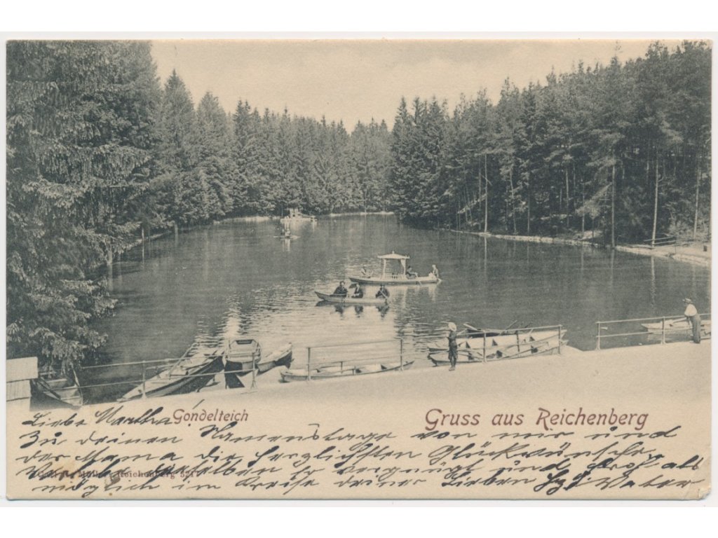 32 - Liberec, Gruss aus Reichenberg, Gondelteich, prošlé poštou 1909