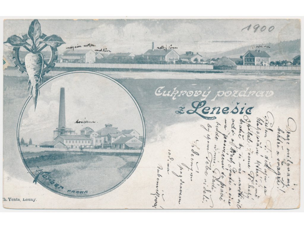 34 - Lounsko, Lenešice, koláž, "Cukrový pozdrav", zaniklý cukrovar, cca 1903