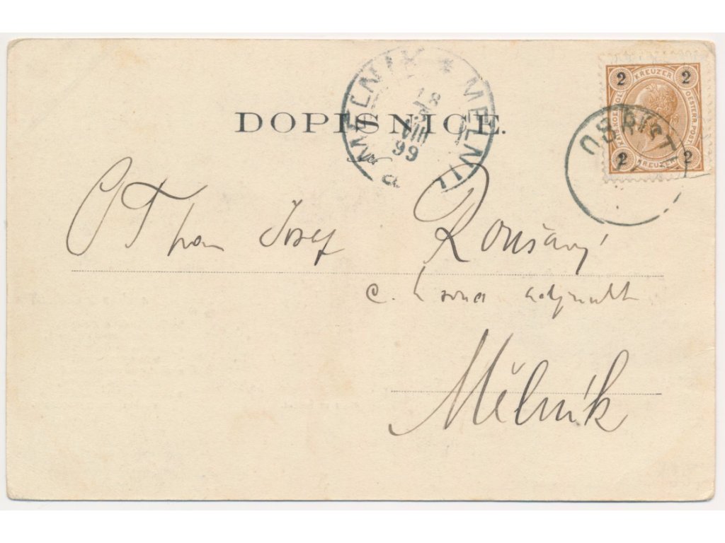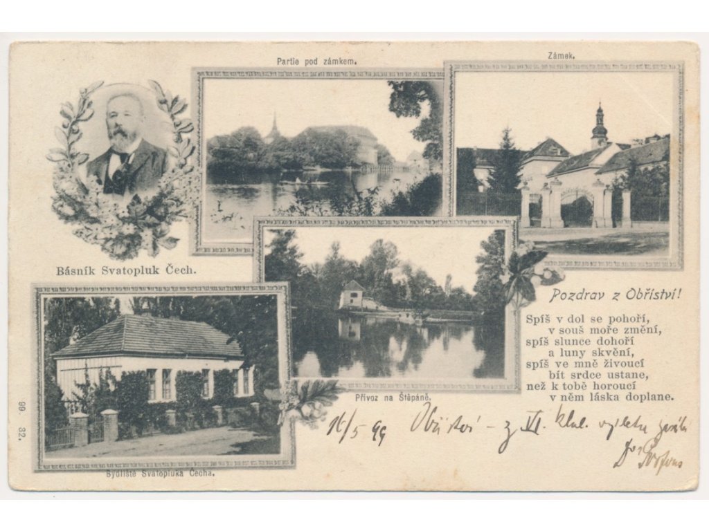 35 - Mělnicko, Obříství, 4 záběrová koláž s dominantami obce, cca 1899