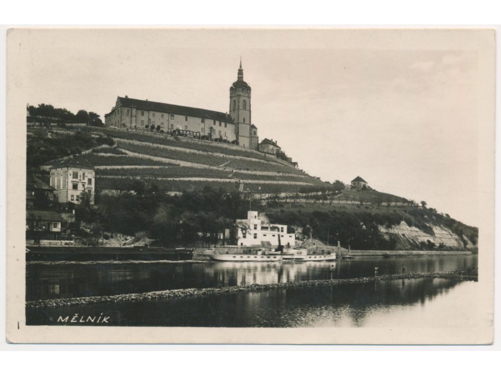 35 - Mělník, pohled na zámek, parník na řece, cca 1933