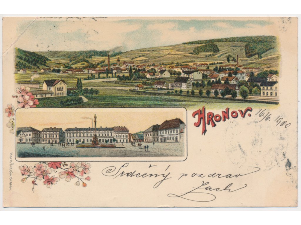 38 - Náchodsko, Hronov, 2 záběrová koláž, Náměstí, Celk. pohled, 1900, lom v růžku