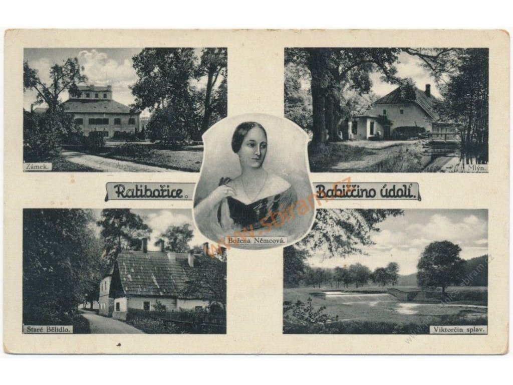 38 - Náchodsko, Ratibořice, 4 - záběr Babiččina údolí + portrét B. Němcové, cca 1940