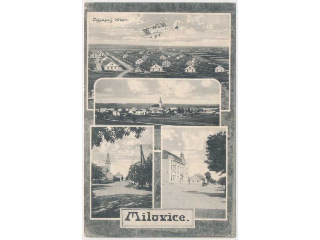40 - Nymbursko, Milovice, 4 záběrová koláž, mj. vojenský tábor, cca 1924