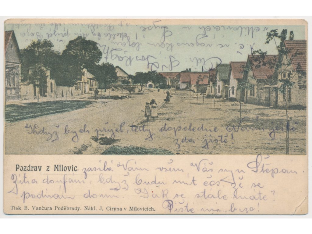 40 - Nymbursko, Milovice, partie z náměstí, cca 1905, vada - lom v růžku