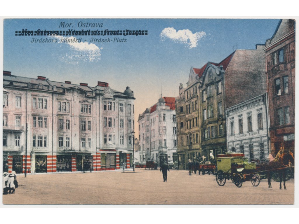 43 - Ostrava, Moravská Ostrava, oživené Jiráskovo náměstí, koňský kočár.., cca 1915