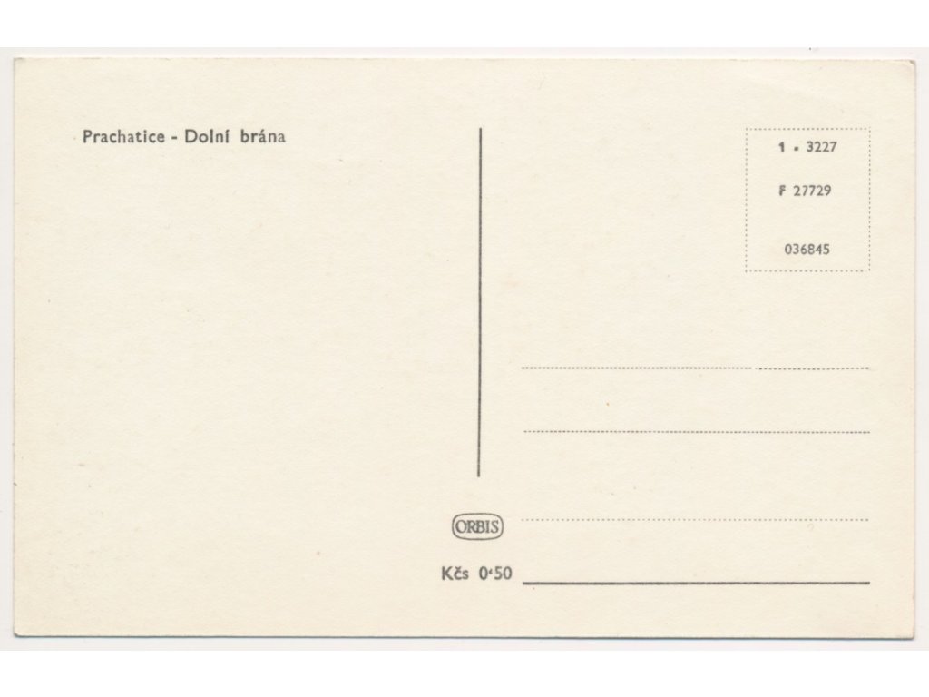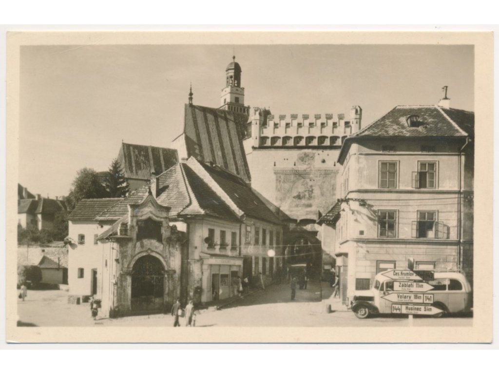 48 - Prachatice, oživená partie s autobusem u Dolní brány, cca 1950