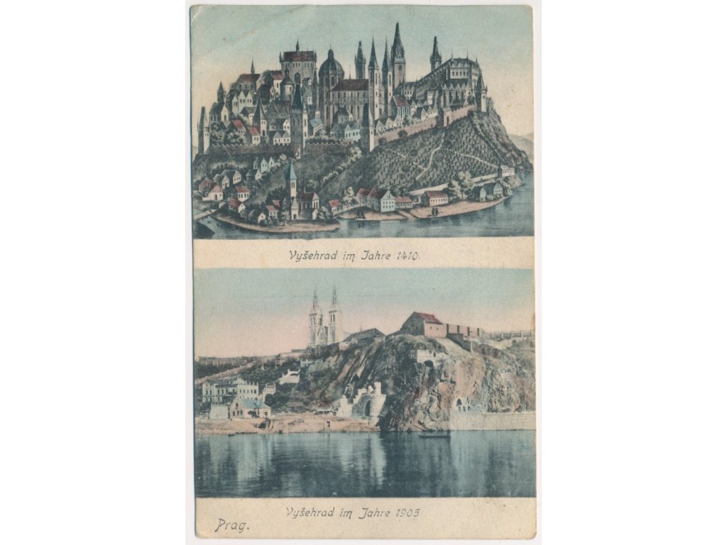 49 - Praha, 2 záběr, Vyšehrad v roce 1410 a 1905, prošlá poštou 1906