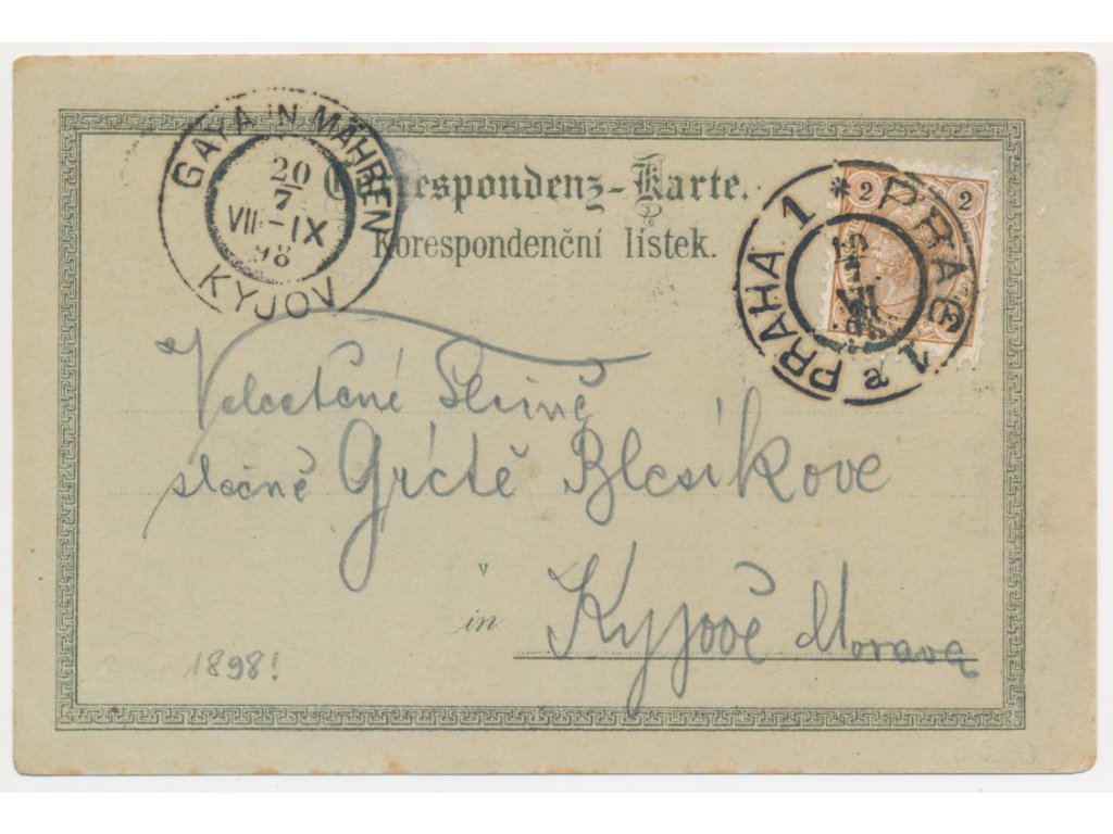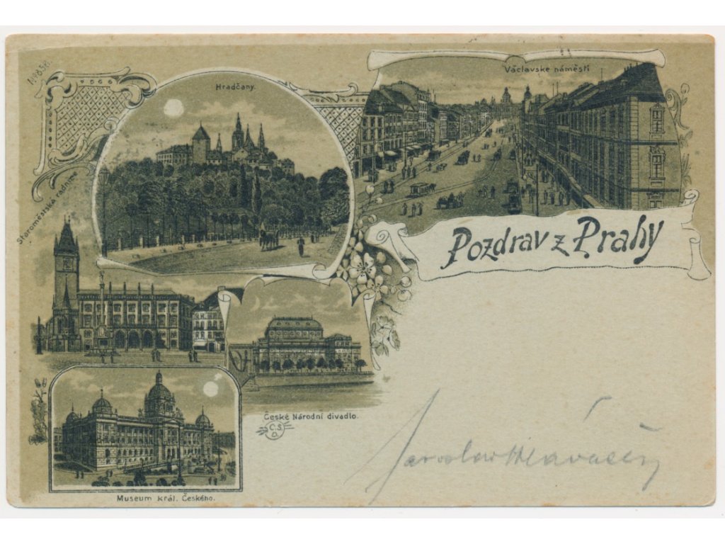 49 - Praha, 5-ti záběrová litografie, mj. Muzeum, Hradčany, Divadlo..., 1898
