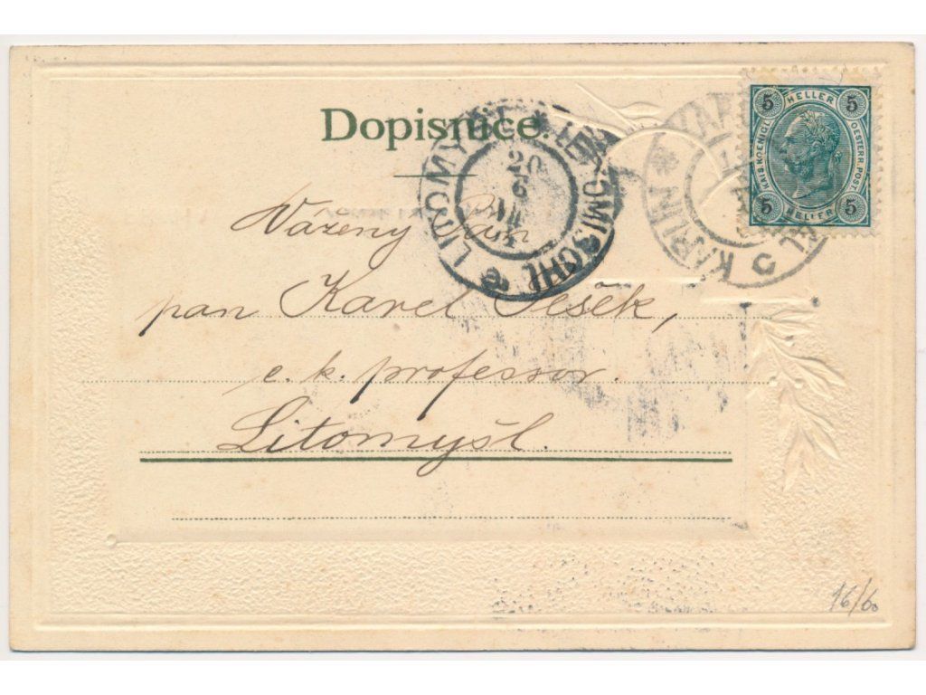 49 - Praha, Erbová reliéfní koláž s pohledem na Akademii hraběte Straky (Strakova akademie), 1904