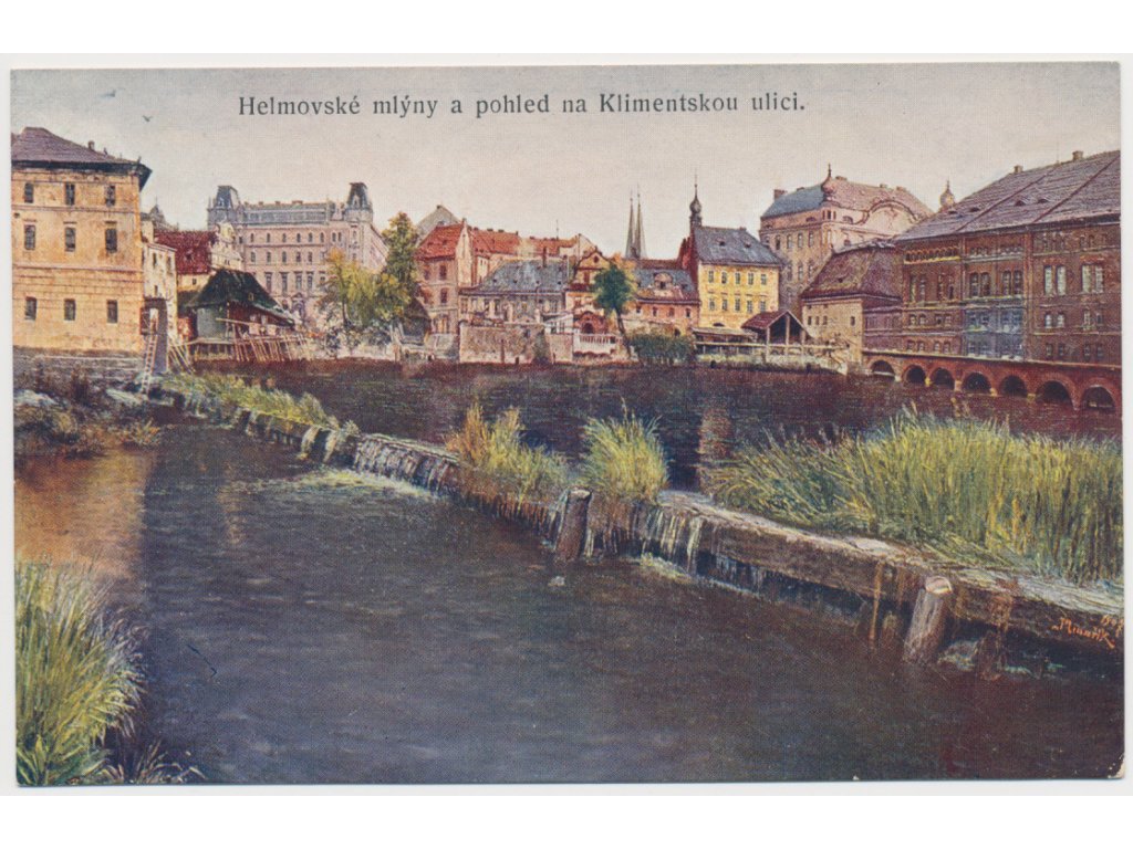49 - Praha, Helmovské mlýny a pohled na Klimentskou ulici, cca 1920