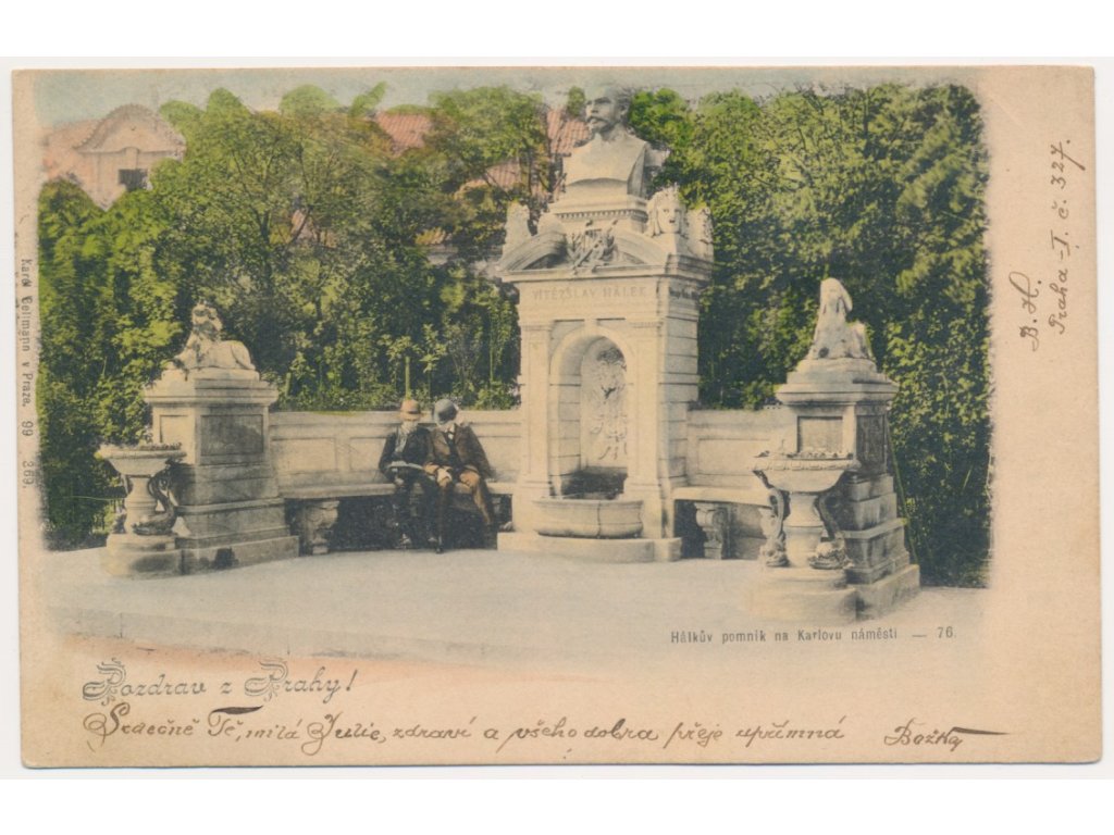 49 - Praha, Karlovo náměstí, oživená partie u Hálkova pomníku, K. Bellmann, 1899