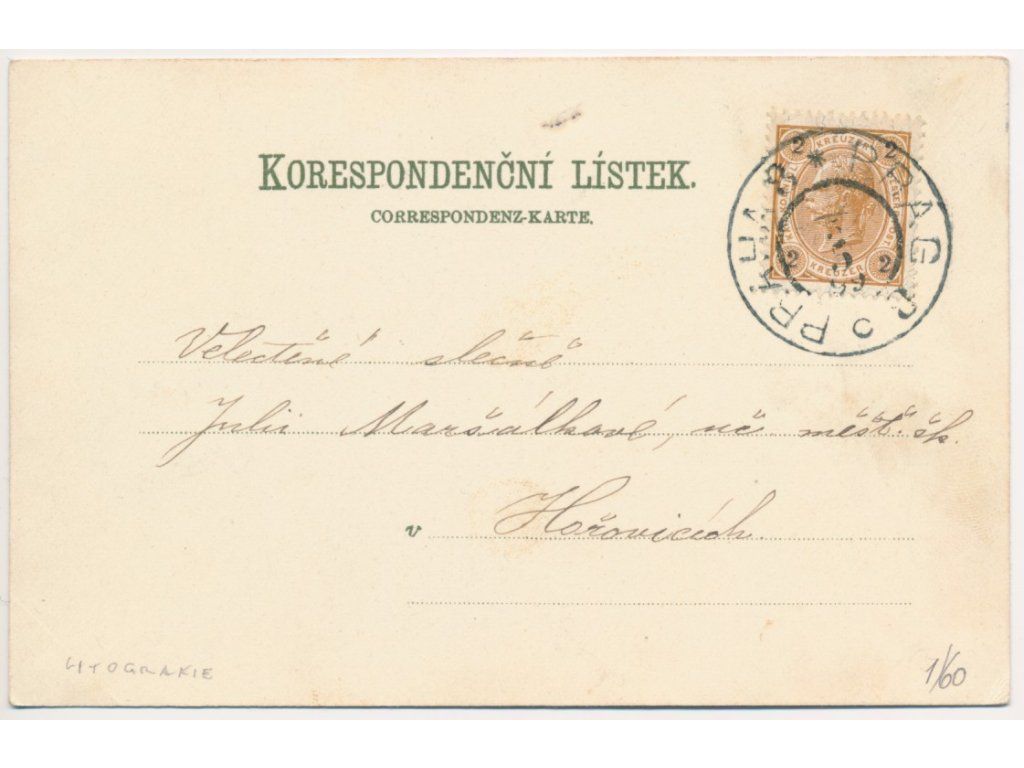 49 - Praha, litografie, Staroměstské mlýny, prošlá poštou 1899