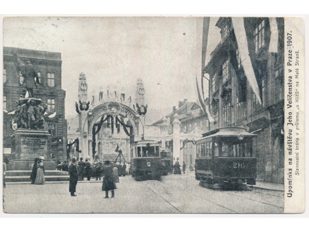 49 - Praha, Malá Strana, Slavnostní brána, lidé, tramvaje..., 1907