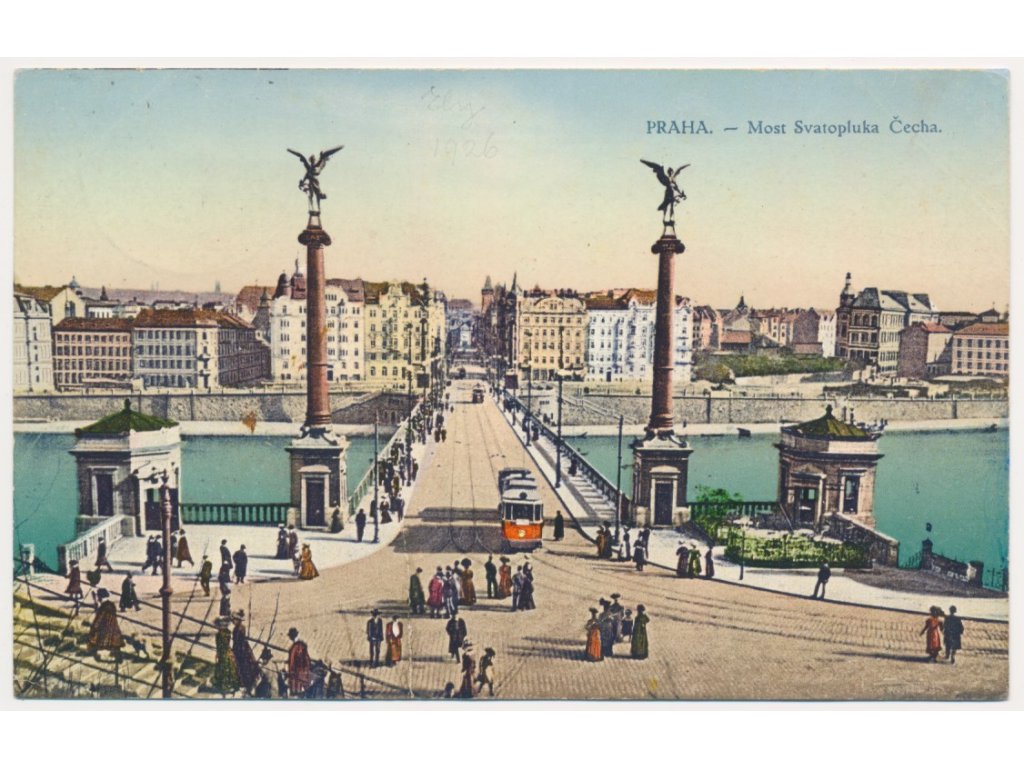 49 - Praha, Most Svatopluka Čecha, oživená partie s tramvají, 1928