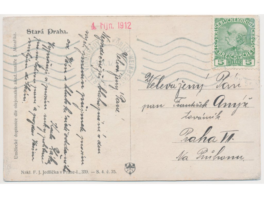 49 - Praha, Platnéřská ul. u pivovaru Křižovníků, dle malíře J. Minaříka, 1912
