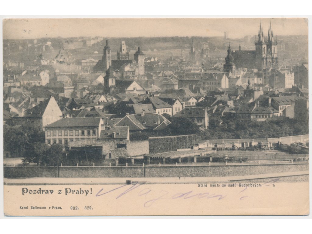 49 - Praha, Pohled na Staré město ze sadů Rudolfových, K. Bellmann, 1902