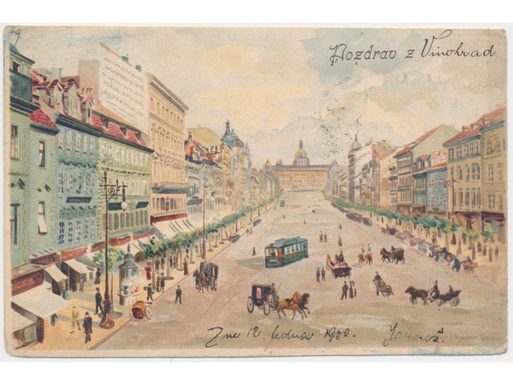 49 - Praha, pohled na Václavské náměstí, lidé, tramvaj, koňský kočár, cca 1900