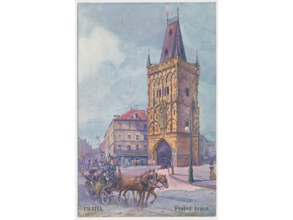 49 - Praha, Prašná brána, kočár s koňmi, cca 1909