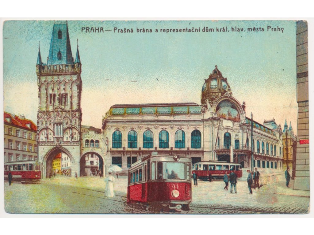 49 - Praha, Prašná brána a representační dům, lidé, tramvaje..., cca 1908