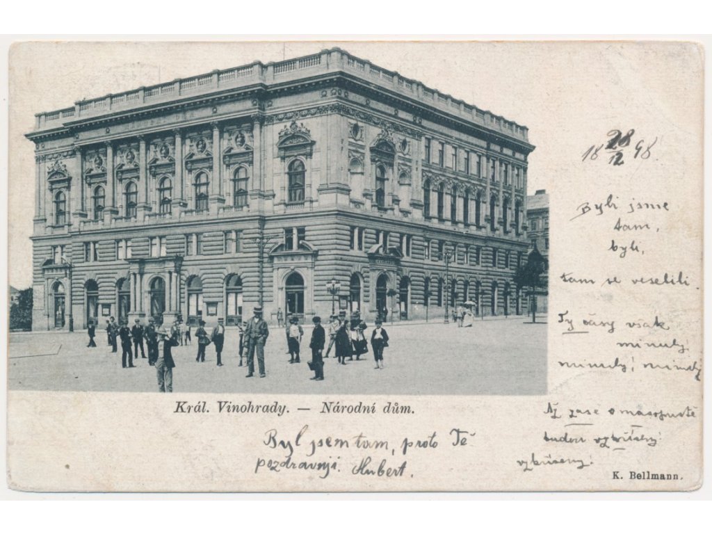 49 - Praha, Vinohrady, oživená partie před Národním domem, cca 1898