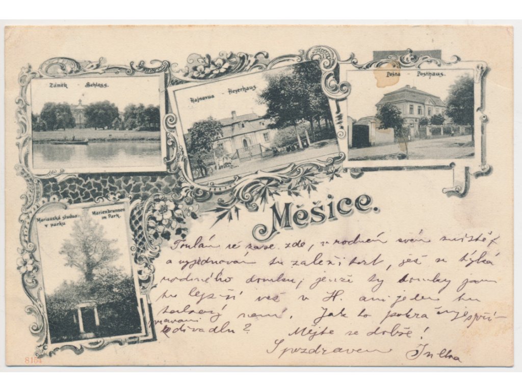 50 - Praha-východ, Měšice, 4 záběrová koláž, mj. Pošta, Hájovna, Zámek, 1899