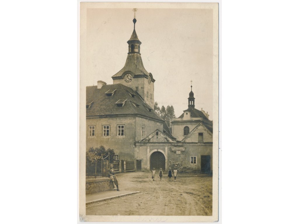 51 - Praha-západ, Dobřichovice, oživená partie u kostela, cca 1930
