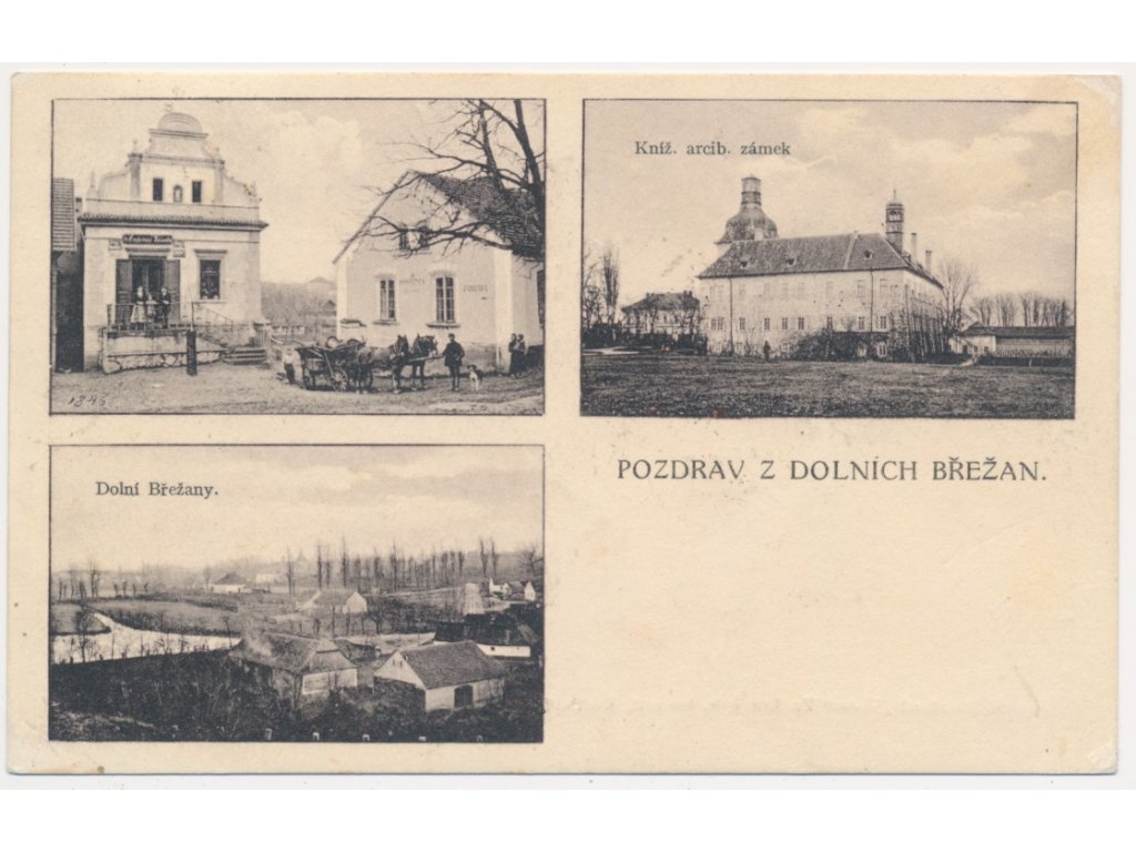 51 - Praha-západ, Dolní Břežany, 3 záběr, Hostinec, Zámek, Celk. pohled, 1914