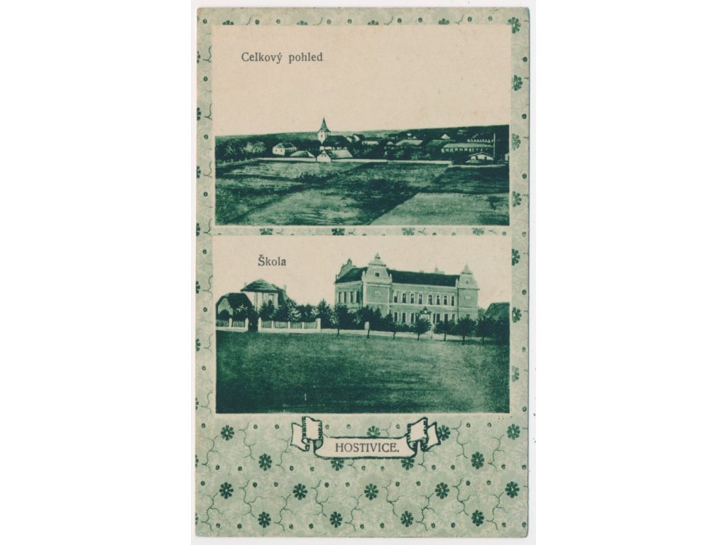 51 - Praha-západ, Hostivice, 2 záběrová koláž, Škola, Celkový pohled, 1921