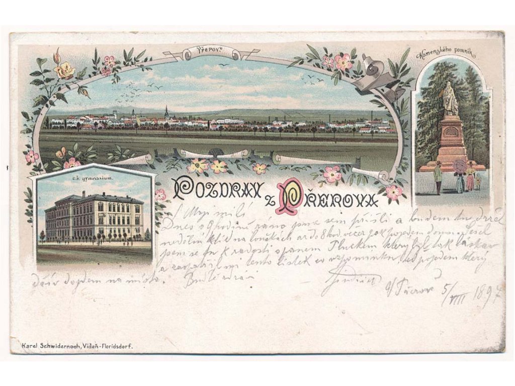 53 - Přerov, 3 záběrová litografie, gymnázium, pomník, celk. pohled, cca 1897
