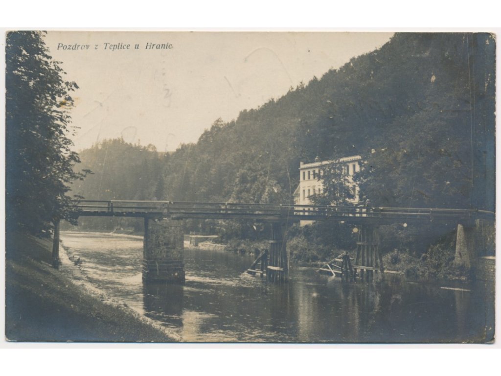 53 - Přerovsko, Teplice nad Bečvou, pohled od řeky na lázeňskou budovu, cca 1920