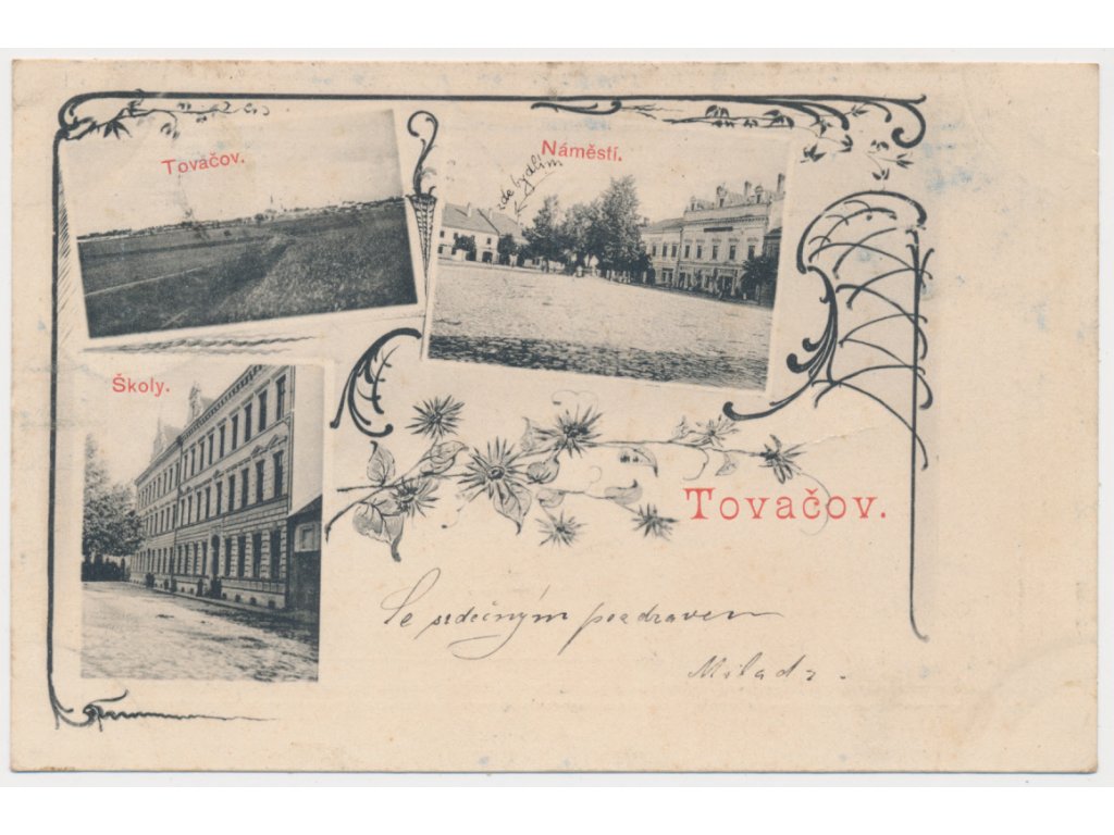 53 - Přerovsko, Tovačov, 3 - záběrová koláž, Náměstí, Školy..., cca 1899