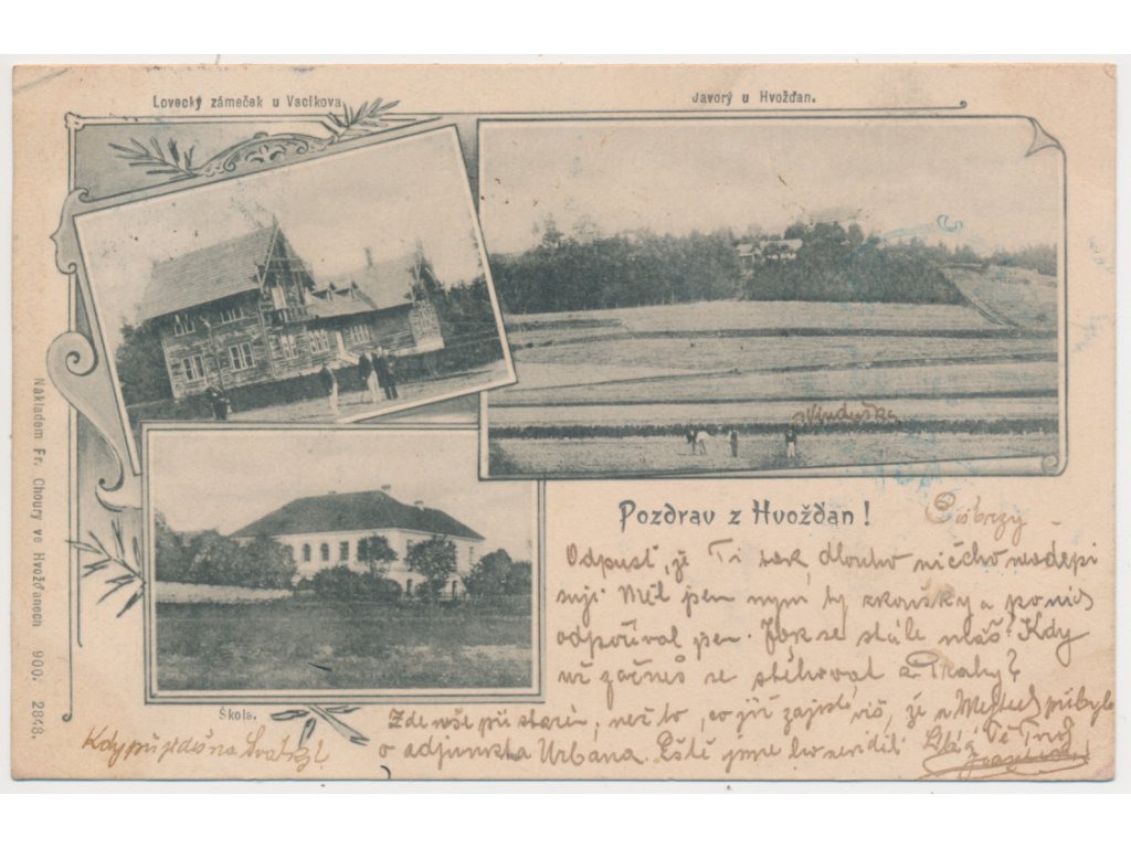 54 - Příbramsko, Hvožďany, 3 záběrová koláž, mj. Škola, Lovecký zámeček, 1900