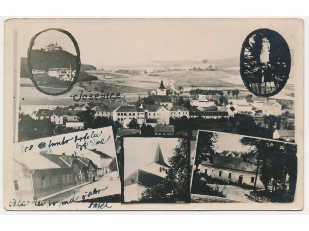 54 - Příbramsko, Jesenice, 6-ti záběrová koláž dominant obce, cca 1937