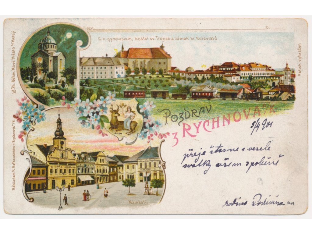 57 - Rychnov nad Kněžnou, 3 záběrová litografie s dominantami města, 1901