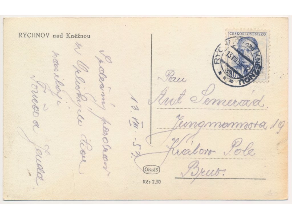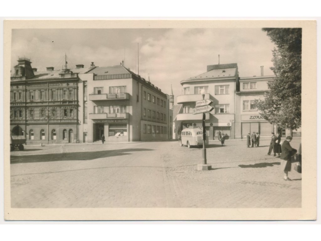 57 - Rychnov nad Kněžnou, oživená partie z náměstí s autobusem, 1953